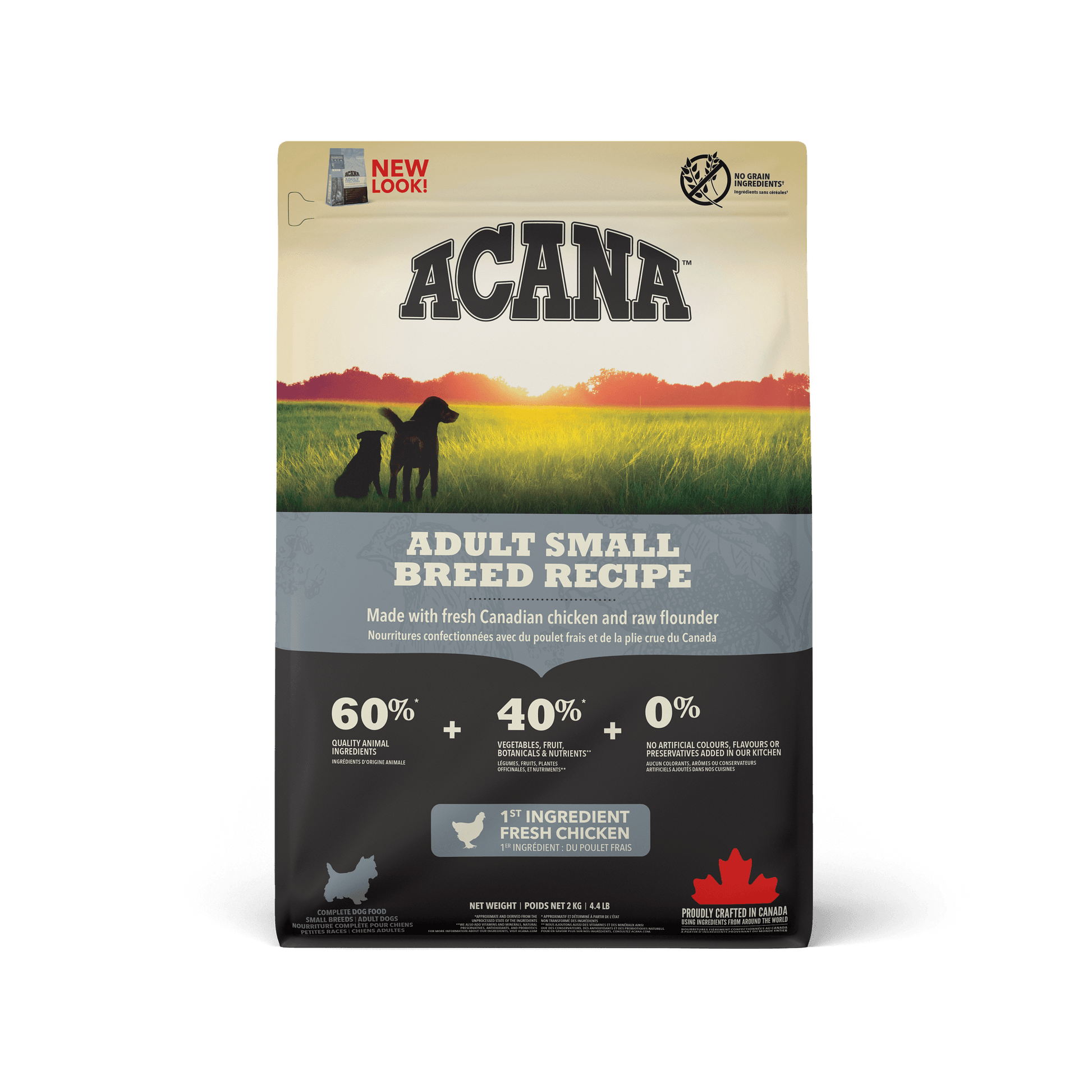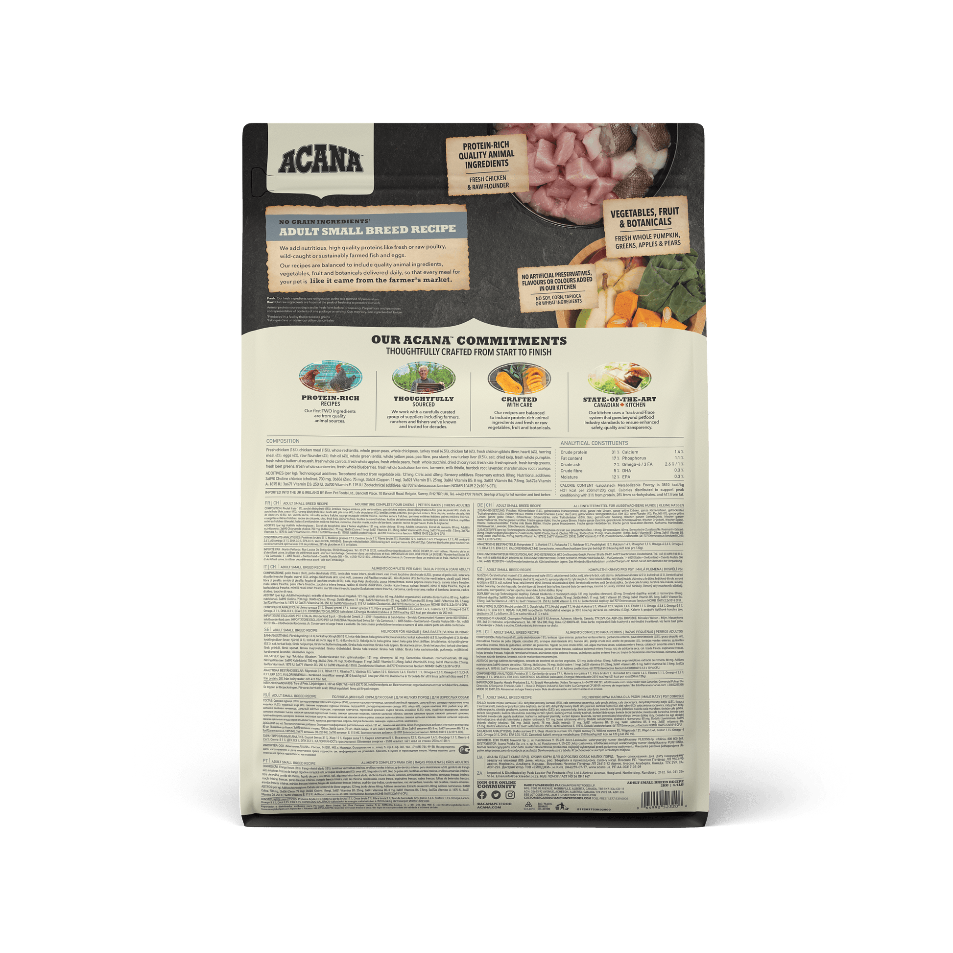 ACANA Dog Adult Small Breed is designed to meet the unique nutritional needs of small breed dogs. With 60% quality animal ingredients like fresh Canadian chicken and raw flounder, and 40% fruits, vegetables, and botanicals, this recipe provides the protein and nutrition small breed dogs need to thrive. Every meal of Acana Adult Small Breed is fresh and natural, like it came from the farmer's market.