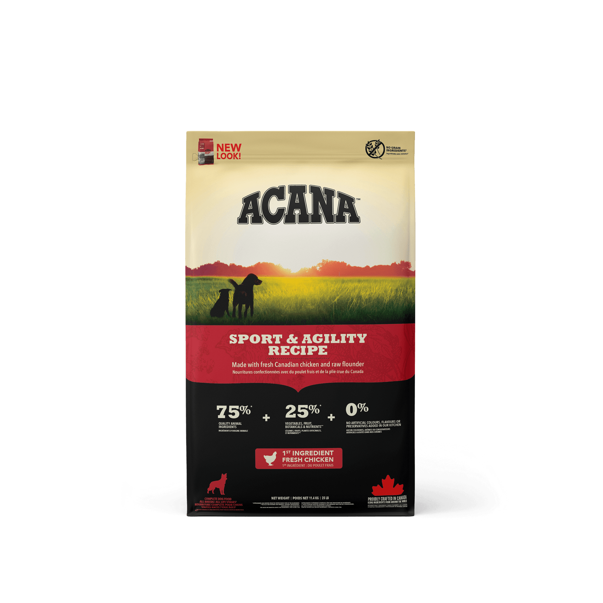 ACANA Sport + Agility Dry Dog Food Recipe is a tailored diet for active and energetic pups featuring 75% fresh animal ingredients like Canadian chicken and raw flounder, complemented by 25% fruit, vegetables and botanicals for a balanced meal. This nutrient-dense formula helps your pup get the protein and energy they need to maintain a healthy, active lifestyle.