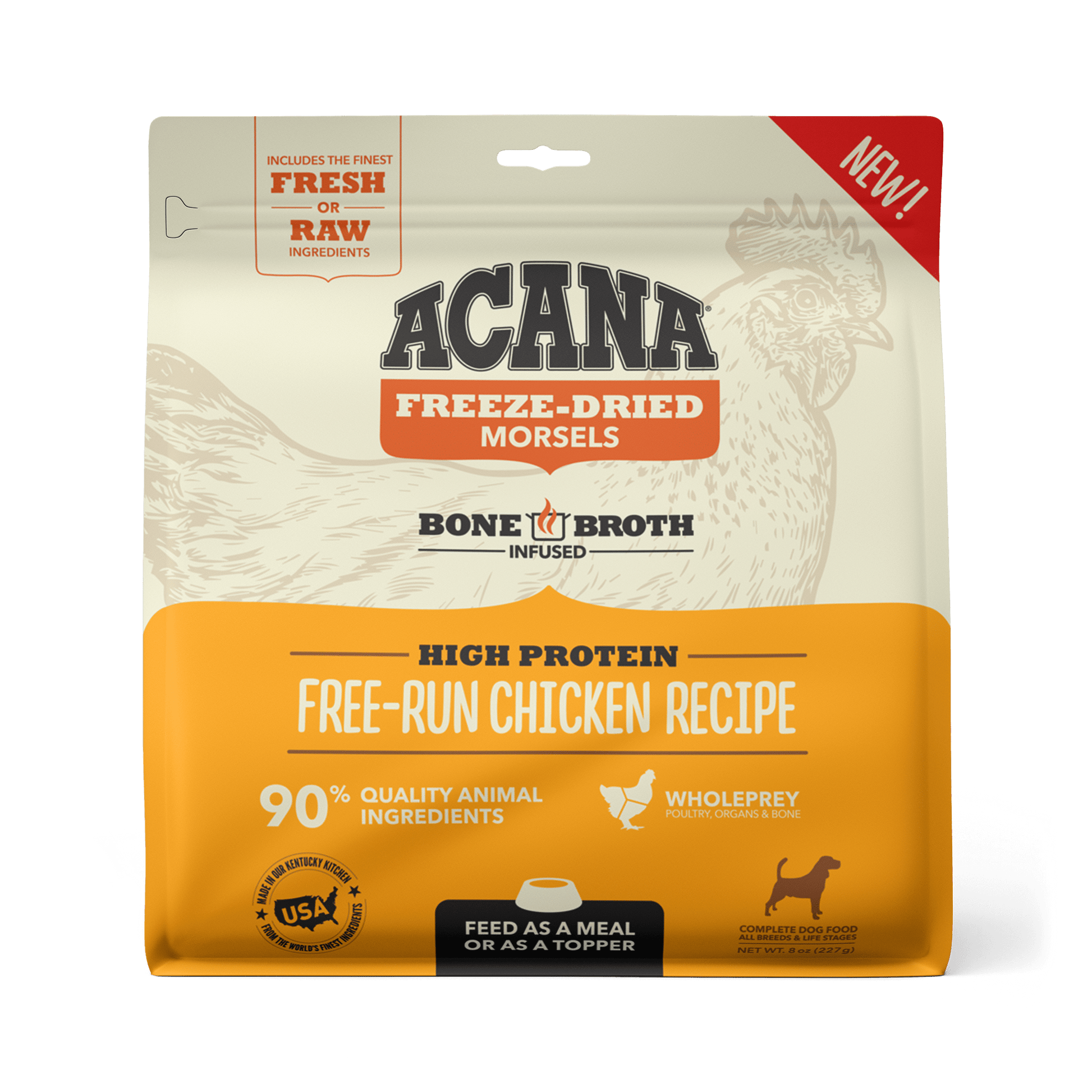 With all the benefits of raw nutrition and none of the mess, ACANA® Freeze-Dried Food, Free-Run Chicken Recipe satisfies your dog’s natural cravings in a convenient, freeze-dried form. Made from *90% quality animal protein from free-run chicken** and infused with delicious bone broth, you can serve morsels on their own or as a topper at mealtime.