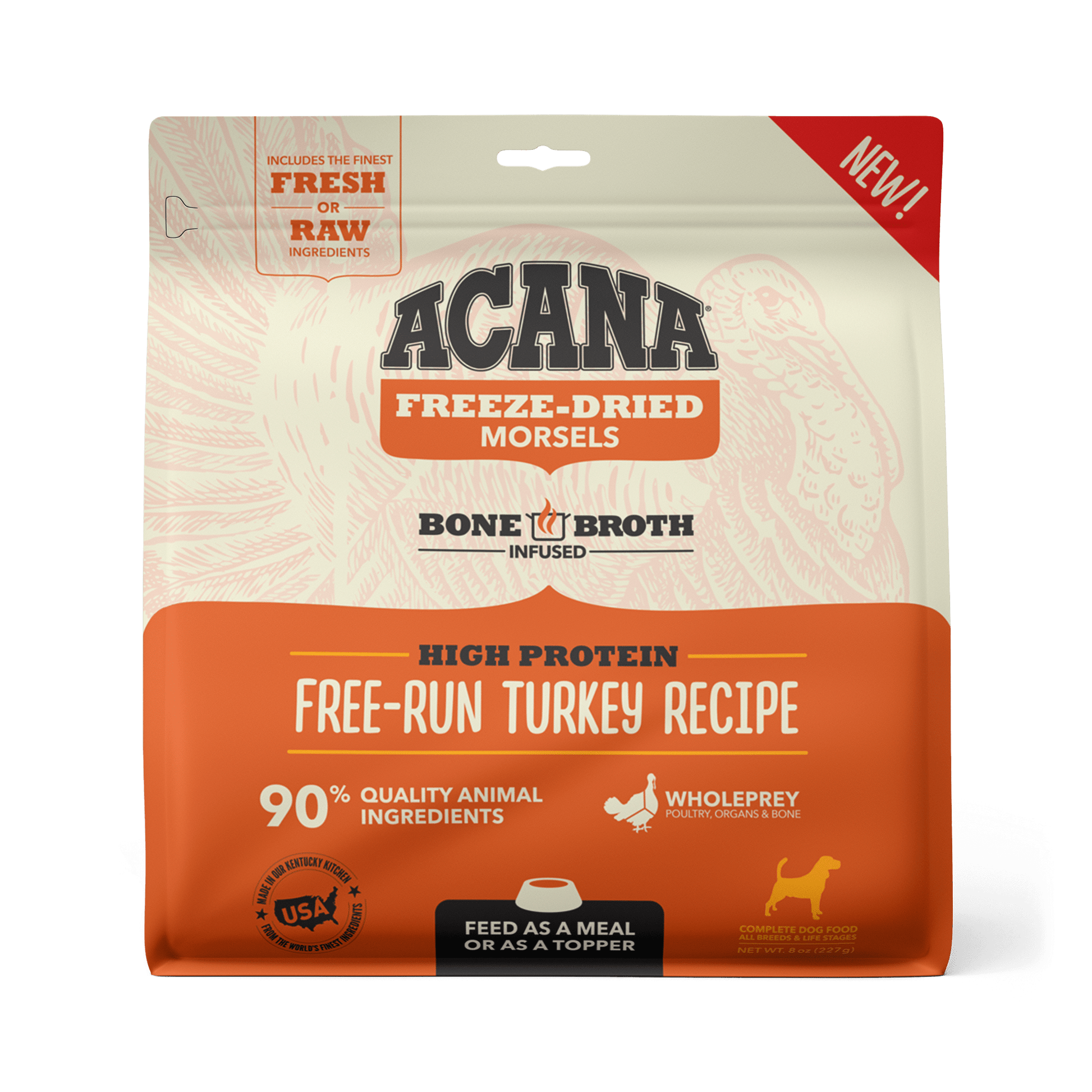 ACANA Freeze-Dry Free-Run Turkey Recipe Is formulated to meet the nutritional levels established by the AAFCO Dog Food Nutrient Profiles for All Life Stages, including growth of large size dogs (70 lb. or more as an adult).
