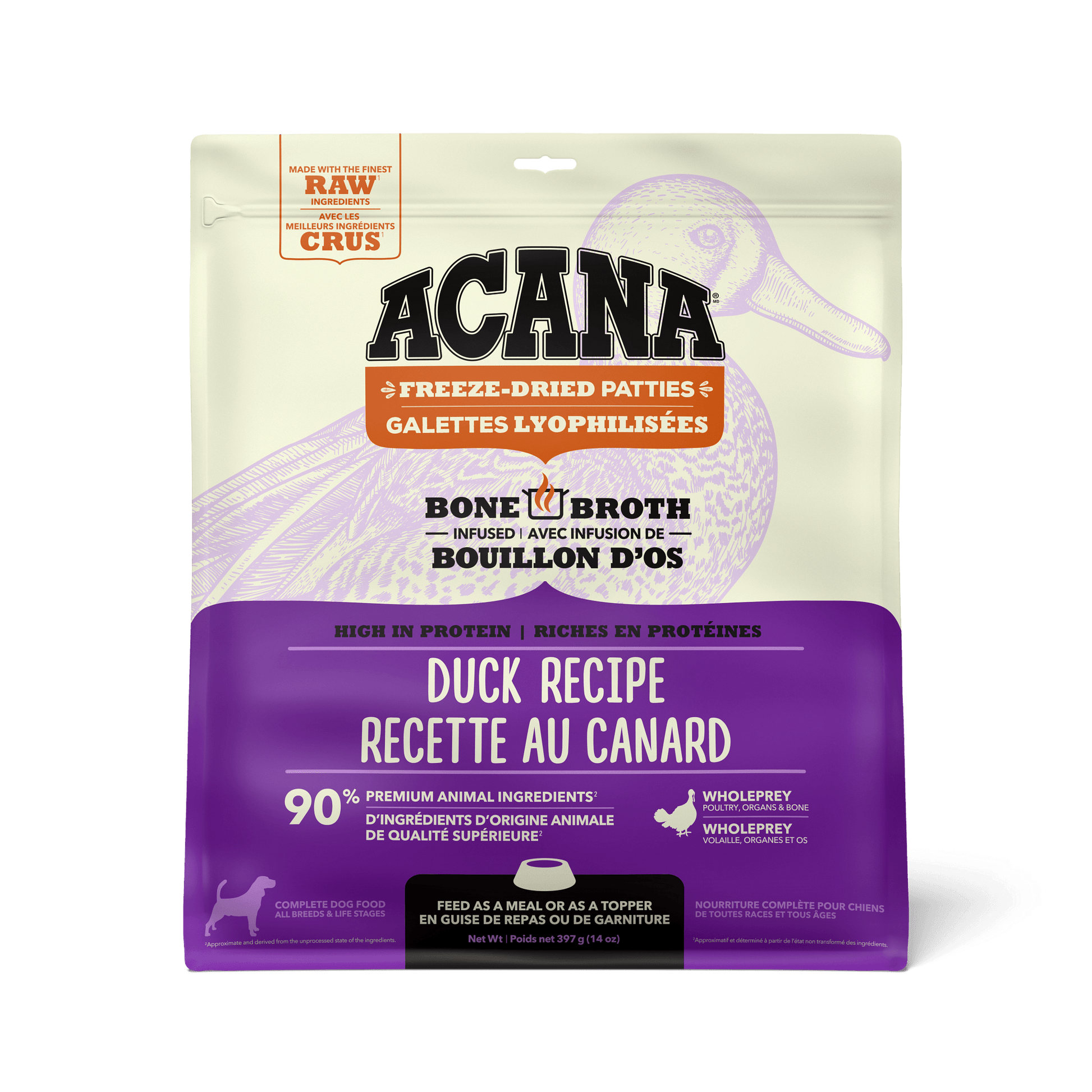 ACANA Freeze-Dried Food Patties Duck Recipe offer a simple way to give your pup the same nutrition as a raw diet without the hassle. High in protein, these patties are made with 90% animal ingredients such as duck, chicken, turkey, organs, and bone, and balanced with nutritious vegetables and fruit. Plus, the delicious bone broth infuses every bite for a flavor dogs crave.