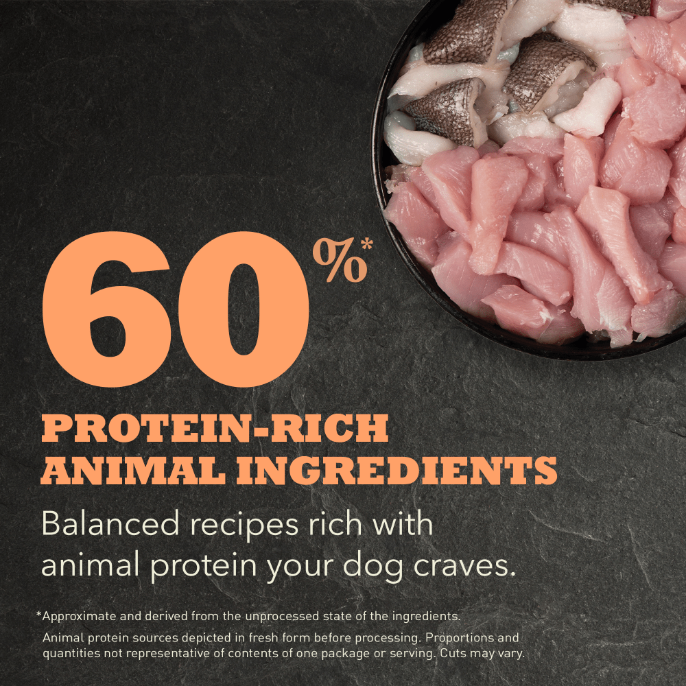 Your dog may not roam the wilderness like their ancestors did, but that doesn't mean you shouldn't feed them like they don't. ACANA makes only foods that are rich in meat and protein variety, with wholeprey meat ratios and limited carbohydrates, replacing fast carbs with low glycemic, healthy fruits and vegetables. With a state of art brand new kitchen in Kentucky, all ACANA foods are sourced and made right here in the USA by trusted farmers. With human grade ingredients that typically arrive at the kitchens within 48 hours of harvesting, fresh is the entire basis of ACANA’s brand. Ingredients like heritage red meats from the Appalachian ranching country, free run poultry and eggs, wild caught fish from New England, whole fruits and vegetables like Bartlett pears and butternut squash, and locally grown botanicals from Kentucky, ACANA believes the healthiest foods are made here at home in Kentucky, never outsourced. ACANA nourishes your pet's instinct for real, fresh meats and high quality grain-free carbohydrates. It's everything Mother Nature intended, and nothing she did not.