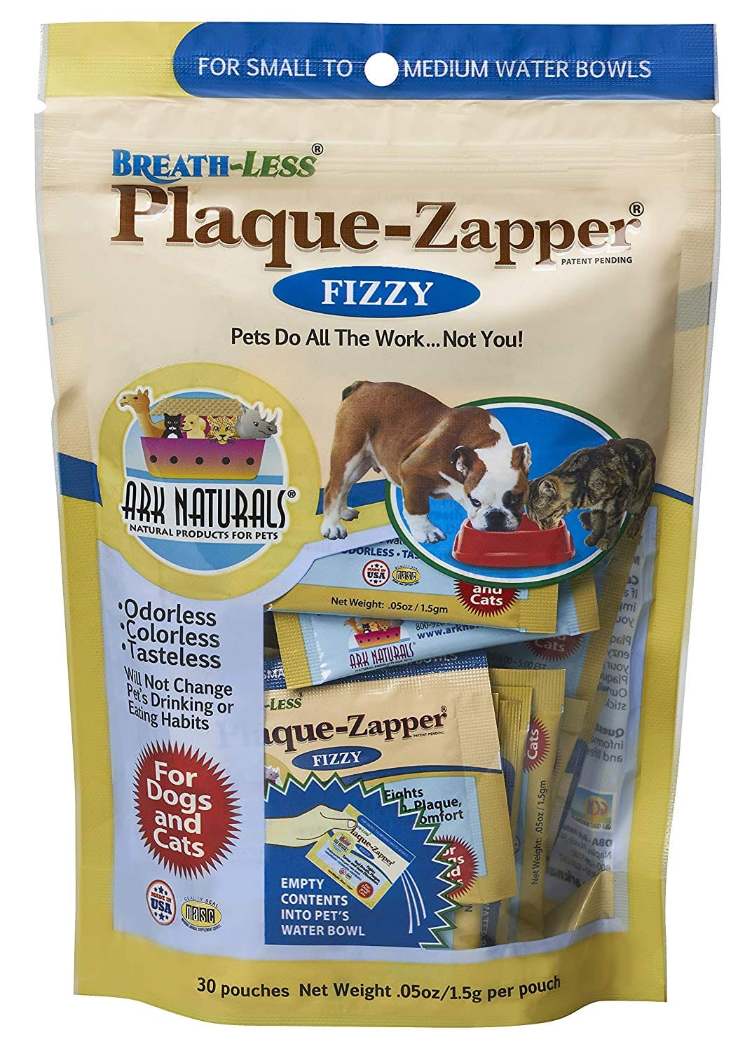 BREATH-LESS Plaque-Zapper patent pending is a hassle-free way pet guardians can help their pets have healthy teeth and gums. Putting Plaque-Zapper in your pets' drinking water helps neutralize the pH level of saliva, deter the growth of bacteria, and control plaque, tartar, and bad breath.