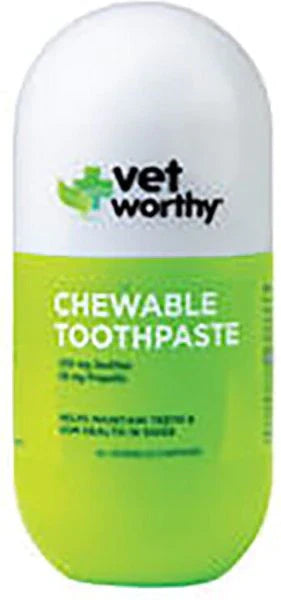Keep your canine’s canines sparkling clean with Vet Worthy Chewable Toothpaste for Dogs. It’s much easier than going through the process of brushing your dog’s teeth—just pop one of these yummy, peanut butter-flavored tablets for better breath and reduced plaque! Key ingredients such as zeolites and propolis keep plaque and tartar from sticking to teeth for a more-sparkling smile you’ll appreciate.