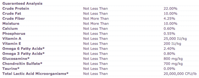 Vitamins: Choline Chloride, Beta-Carotene, Vitamin E Supplement, Ascorbic Acid, Vitamin A Supplement, Niacin, Calcium Pantothenate, Riboflavin, Vitamin D-3 Supplement, Pyrodoxine Hydrochloride, Thiamine Mononitrate, Folic Acid, Biotin, Vitamin K Supplement, Vitamin B-12 Supplement, Glucosamine-HCl, Chondroitin Sulfate, Chicory Root Extract, Green Lipped Mussel, Sea Cucumber, Garlic, Taurine, Yucca Schidigera Extract, Green Tea Extract, Lactobacillus plantarum, Enterococcus faecium, Lactobacillus casei, Lactobacillus acidophilus. Old Mother Hubbard uses ethoxyquin-free meat sources.