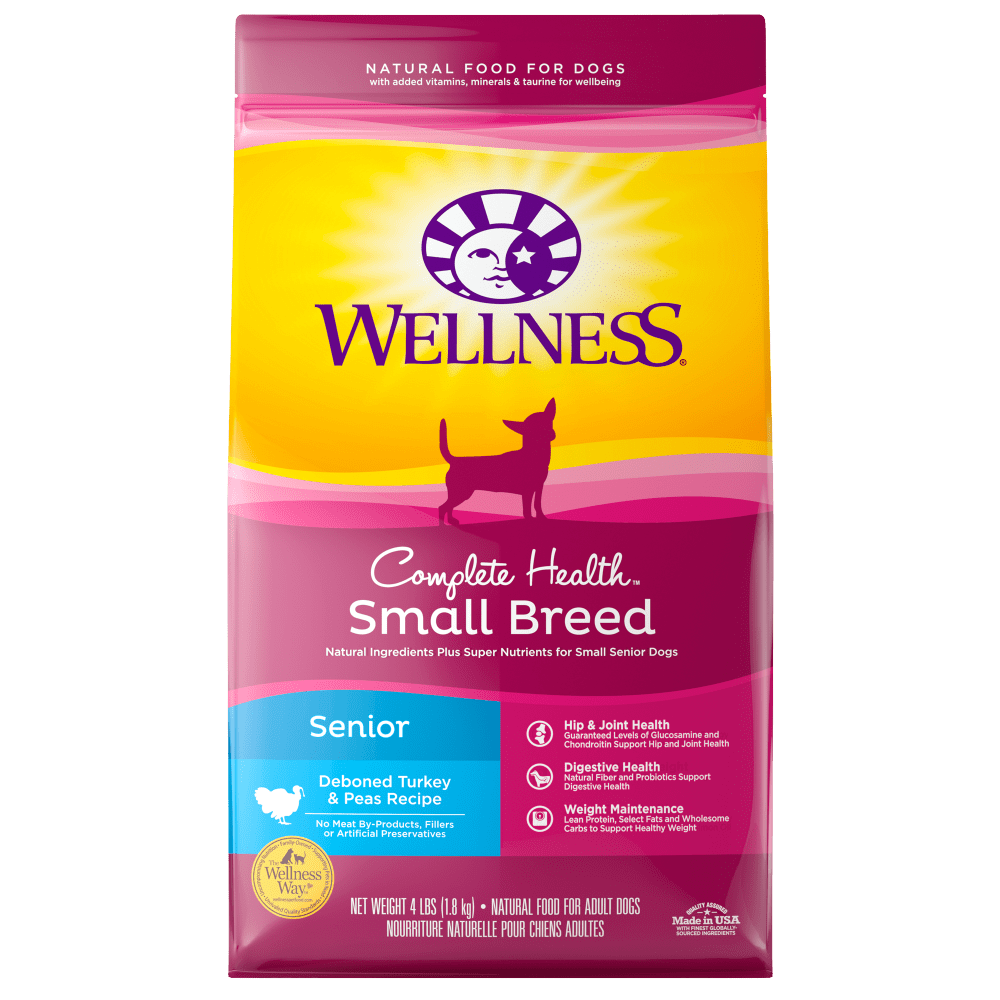 Wellness Complete Health Natural Small Breed Senior Health Recipe Dry Dog Food has a unique make up your small dog needs when they're getting older. This recipe is formulated specifically for your small breed Senior by using nutrient- dense high quality ingredients to support their unique health needs. This recipe will support your dogs heart health by suing controlled sodium levels and is packed with antioxidants from fruits and vegetables such as apples, blueberries, spinach, and sweet potatoes. Small breed Senior dogs need help maintaining lean muscle mass so Wellness uses only high quality animal protein in this recipe, such as deboned Turkey and Chicken Meal. Since it's natural for small breeds to consume less food it's super important they're getting the nutrition they need. This recipe includes a unique mix of complementary ingredients for overall wellbeing for your Senior small breed dog.