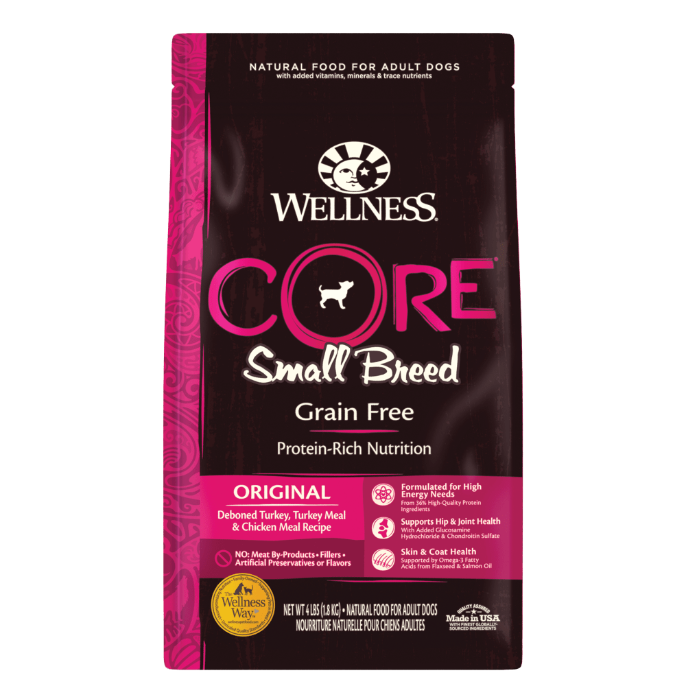 Wellness CORE Grain Free Original Small Breed Recipe is formulated with optimum protein and calorie levels which help support small breeds who tend to have higher energy levels. This recipe has a smaller kibble size to accommodate the smaller mouths of our beloved small breed pets, making it easier for them to eat and enjoy their meals. This nutrient dense recipe includes high quality proteins such as Deboned Turkey, Turkey Meal, and Chicken Meal. In addition, this recipe includes Glucosamine and Chondroitin to help maintain healthy joints and strong bones.