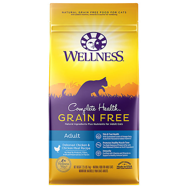 Wellness® Complete Health™ Health Grain Free Adult Chicken Recipe features the right balance of protein & fat with real deboned chicken as the first ingredient. This delicious recipe is formulated with a balanced blend of Omega Fatty Acids, vitamins & minerals to provide the energy your cat needs to thrive.