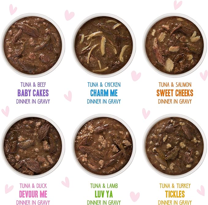The Rainbow A Gogo variety pack includes 2 each of Tuna & Chicken Charm Me, Tuna & Beef Baby Cakes, Tuna & Salmon Sweet Cheeks, Tuna & Lamb Luv Ya, Tuna & Turkey Tickles, and Tuna & Duck Devour Me