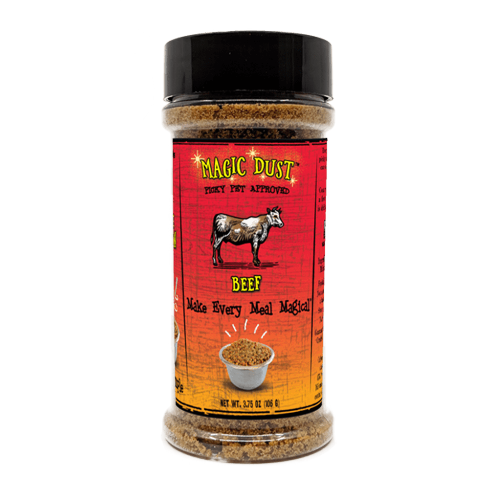 Our Magic Dust is made with high quality, minimal ingredients. It is an excellent feeding solution for pets who won't eat, are transitioning to a new food, or who just want a new flavor with their meals. Just shake on and mix in the Magic Dust with your pet's food (no matter what kind) and make every meal magical. We also recommend adding a little water to the bowl if desired.